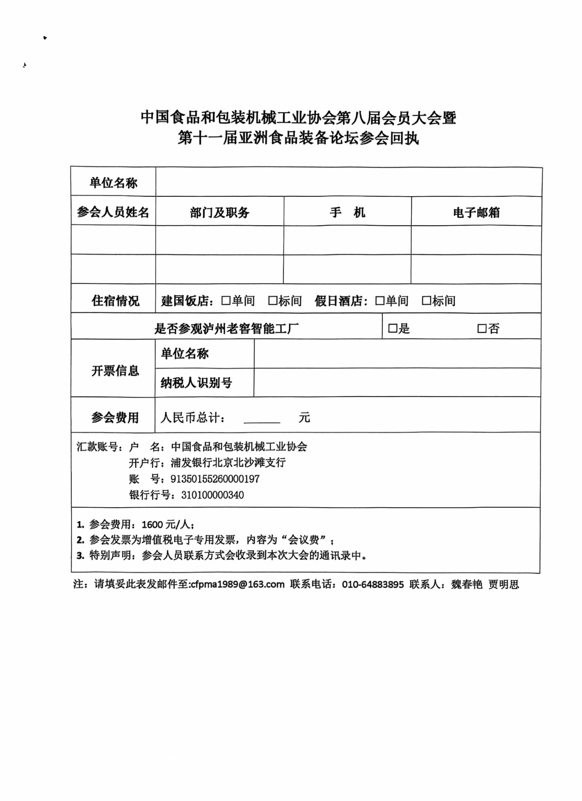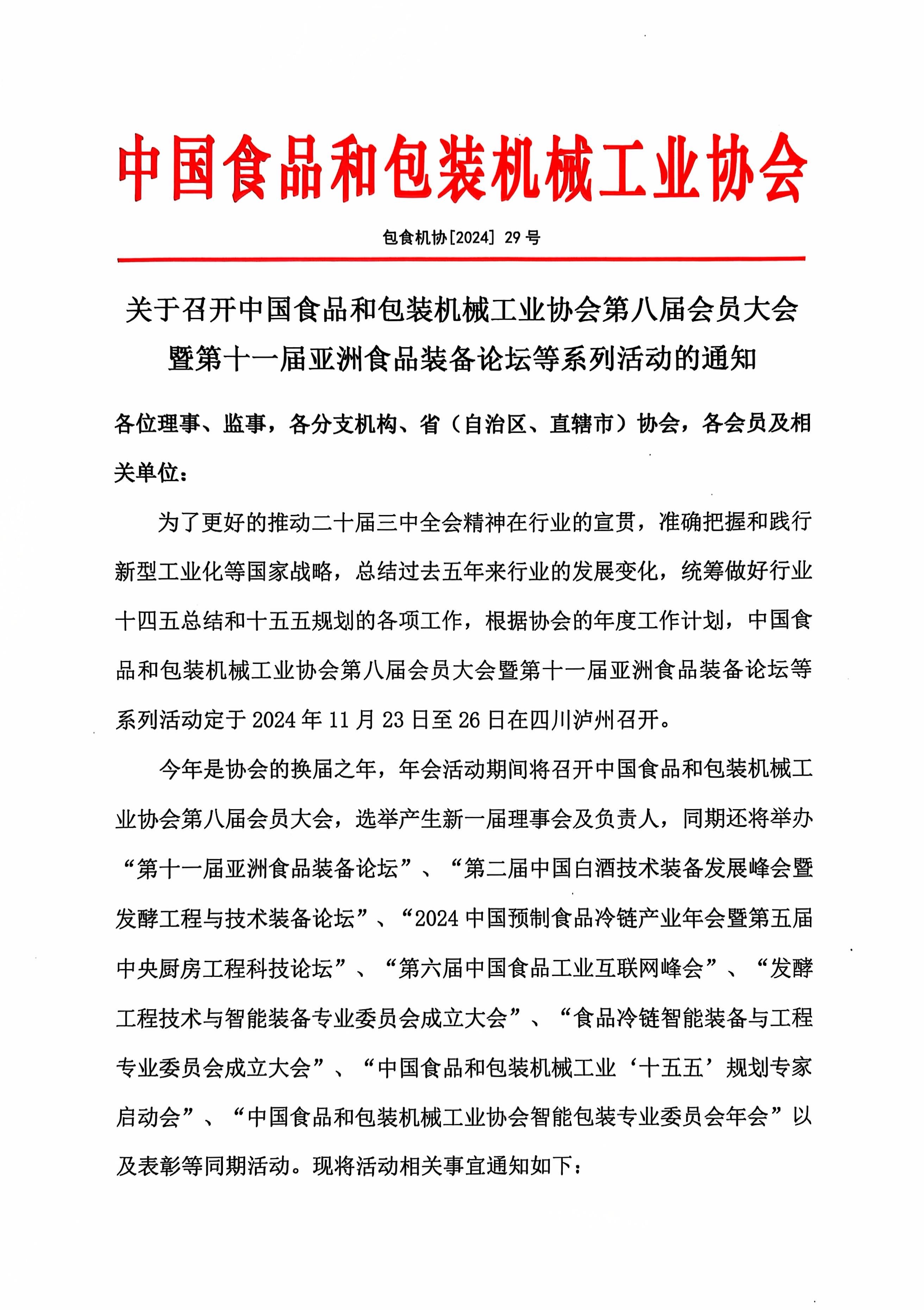 關(guān)于召開中國食品和包裝機(jī)械工業(yè)協(xié)會第八屆會員大會暨第十一屆亞洲食品裝備論壇等系列活動的通知